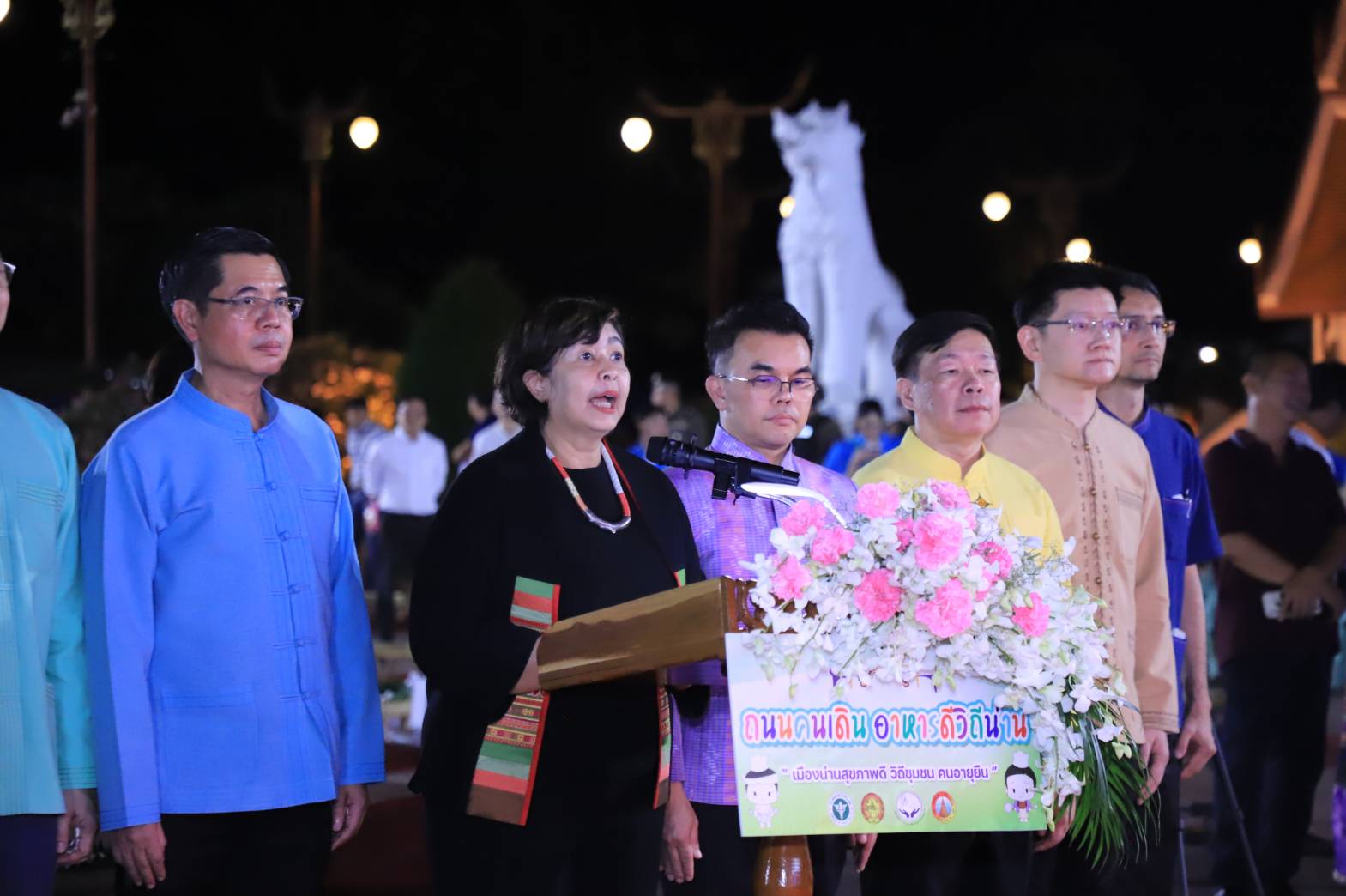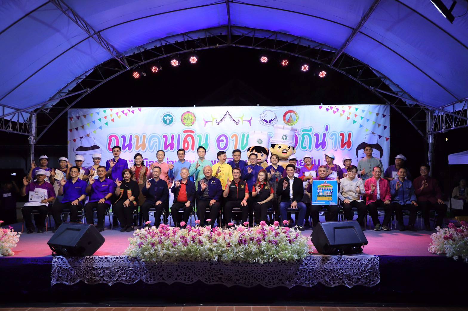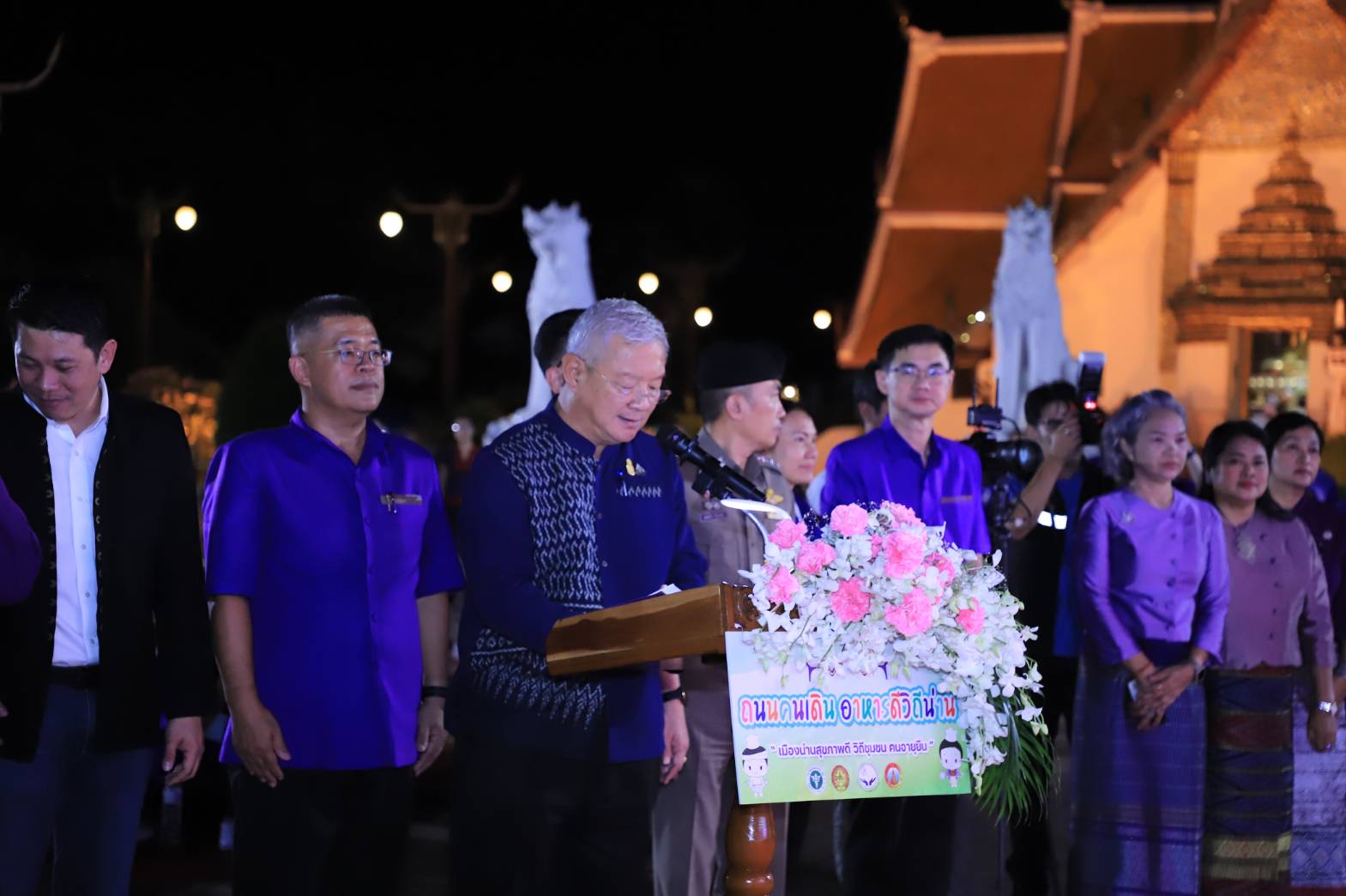 วันนี้ (27 ตุลาคม 2566) นายแพทย์ชลน่าน ศรีแก้ว รัฐมนตรีว่าการกระทรวงสาธารณสุข นายแพทย์โอภาส การย์กวินพงศ์ ปลัดกระทรวงสาธารณสุข แพทย์หญิงอัจฉรา นิธิอภิญญาสกุล รักษาราชการแทนอธิบดีกรมอนามัย พร้อมด้วยผู้บริหารกระทรวงสาธารณสุข ผู้ตรวจราชการกระทรวงสาธารณสุข ผู้บริหารกรมอนามัย สำนักงานสาธารณสุขจังหวัด และเจ้าหน้าที่สาธารณสุขในพื้นที่ร่วมงาน อาหารดีวิถีน่าน พร้อมมอบป้าย Street Food Good Health “อาหารปลอดภัย ใส่ใจสุขภาพ” เพื่อสร้างความเชื่อมั่นนักท่องเที่ยวคนไทยและต่างชาติ ตามนโยบาย “น่านโมเดล” ณ ถนนคนเดิน กาดข่วงเมืองน่าน (วัดภูมินทร์) อำเภอเมือง จังหวัดน่าน