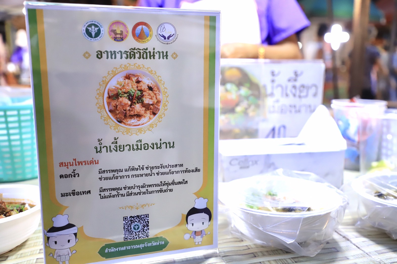 แพทย์หญิงอัจฉรา นิธิอภิญญาสกุล รักษาราชการแทนอธิบดีกรมอนามัย กล่าวเพิ่มเติมว่า ผลการดำเนินงานในปี 2566 พบว่า ประเทศไทยมีถนนอาหารริมบาทวิถีได้รับการรับรองมาตรฐาน Street Food Good Health “อาหารปลอดภัย ใส่ใจสุขภาพ” ของกรมอนามัย ระดับดีขึ้นไป มีจำนวน 76 แห่ง จาก 134 แห่ง คิดเป็นร้อยละ 56.72 โดยแบ่งเป็น ระดับดี จำนวน 55 แห่ง คิดเป็นร้อยละ 41.04 และระดับดีมาก จำนวน 21 แห่ง คิดเป็นร้อยละ 15.67 สำหรับภาคเหนือได้ยกระดับระบบการจัดการสุขาภิบาลอาหารและอนามัยสิ่งแวดล้อมเพื่อส่งเสริมและสนับสนุนการท่องเที่ยวไทย โดยมีอาหารริมบาทวิถีผ่านเกณฑ์มาตรฐานการพัฒนาและยกระดับอาหารริมบาทวิถี ระดับดีขึ้นไป จำนวน 16 แห่ง ซึ่งจังหวัดน่านมีถนนอาหารริมบาทวิถี จำนวน 2 แห่ง คือ กาดข่วงเมืองน่าน และปัว