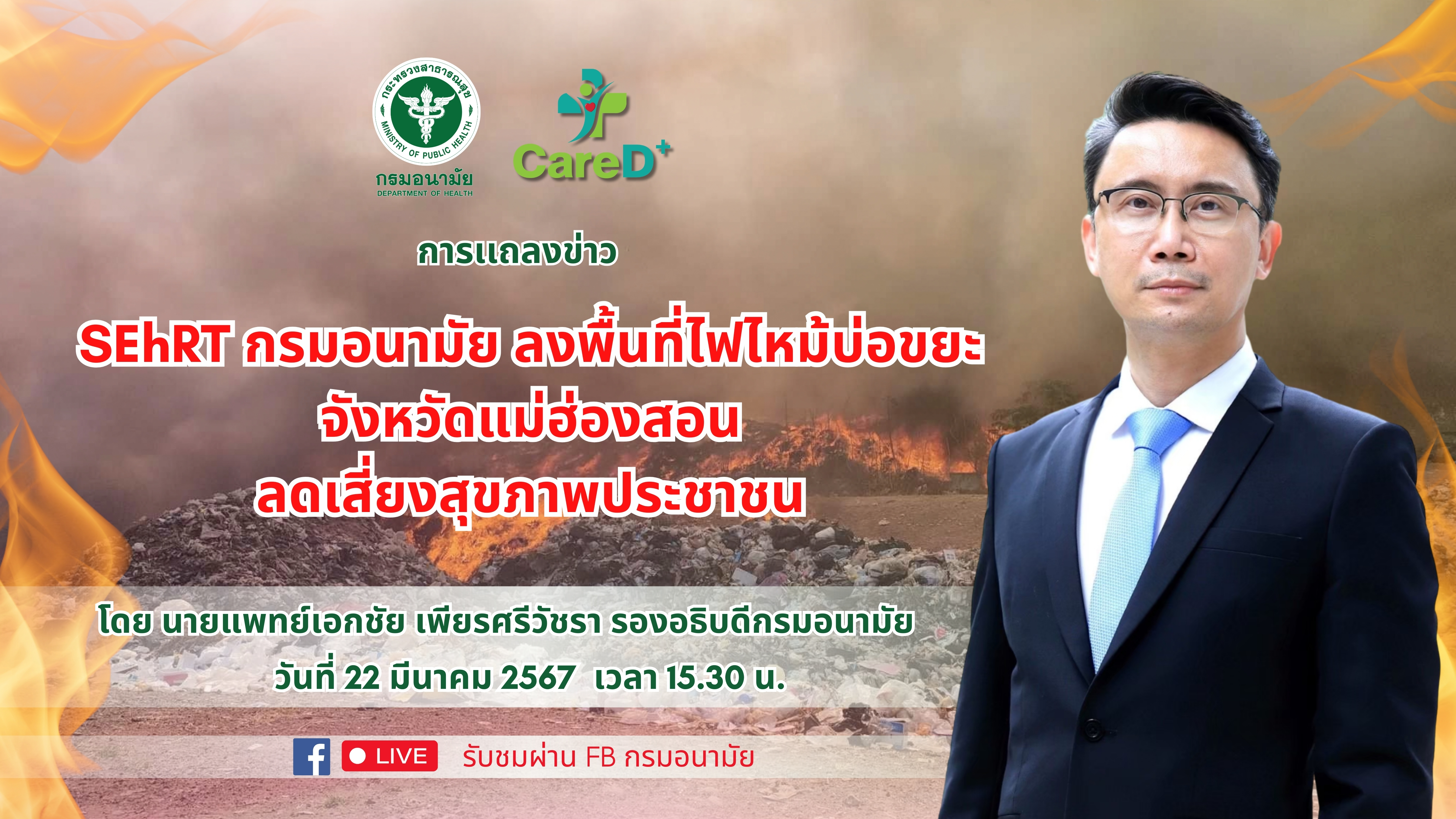 นายแพทย์เอกชัย เพียรศรีวัชรา รองอธิบดีกรมอนามัย กล่าวว่า ขณะนี้ประเทศไทยกำลังเผชิญสถานการณ์ฝุ่นละอองขนาดเล็ก หรือ PM 2.5 ที่มีค่าเกินมาตรฐาน ในหลายจังหวัด โดยเฉพาะจังหวัดเชียงราย เชียงใหม่ ลำปาง ลำพูน น่าน แพร่ พะเยาและแม่ฮ่องสอน ส่งผลให้ประชาชนได้รับผลกระทบด้านสุขภาพ มีอาการไอ มีเสมหะ ระคายเคืองจมูก ตา มีน้ำมูก บางรายรุนแรงถึงขั้นหายใจไม่สะดวก และมีอาการภูมิแพ้กำเริบ และล่าสุดเกิดเหตุไฟไหม้บ่อขยะเทศบาลตำบลแม่ลาน้อย อำเภอแม่ลาน้อย จังหวัดแม่ฮ่องสอน มีไฟลุกลามไปทั่วบริเวณ และมีกลุ่มควันจำนวนมากฟุ้งกระจายไปยังชุมชนใกล้เคียง ทำให้ประชาชนได้รับความเสี่ยงและอันตรายต่อสุขภาพจากควันไฟและฝุ่นละอองจากการเผาไหม้ดังกล่าว โดยเฉพาะกลุ่มเสี่ยงกลุ่มเปราะบางในพื้นที่ ได้แก่ เด็กเล็ก คนท้อง คนแก่ และผู้มีปัญหาโรคระบบทางเดินหายใจ ซึ่งขณะนี้ เหตุการณ์ดังกล่าว ได้ควบคุมสถานการณ์ไฟไหม้ได้แล้ว แต่ยังคงมีควันและฝุ่นละอองมายังชุมชนใกล้เคียง