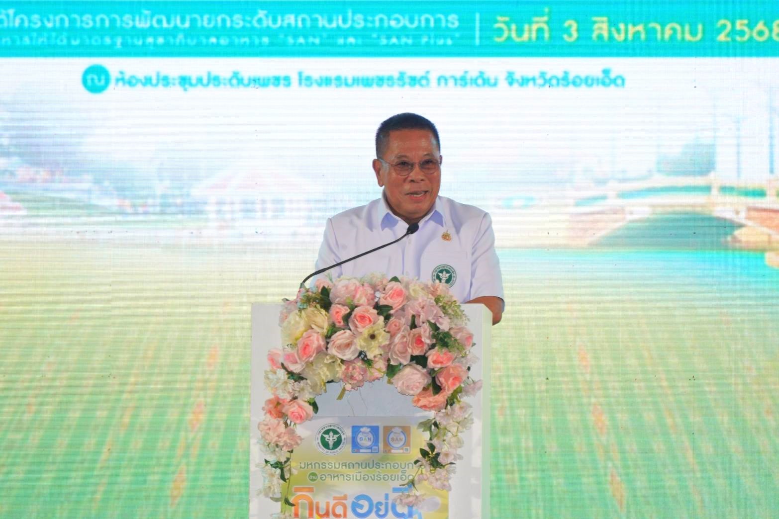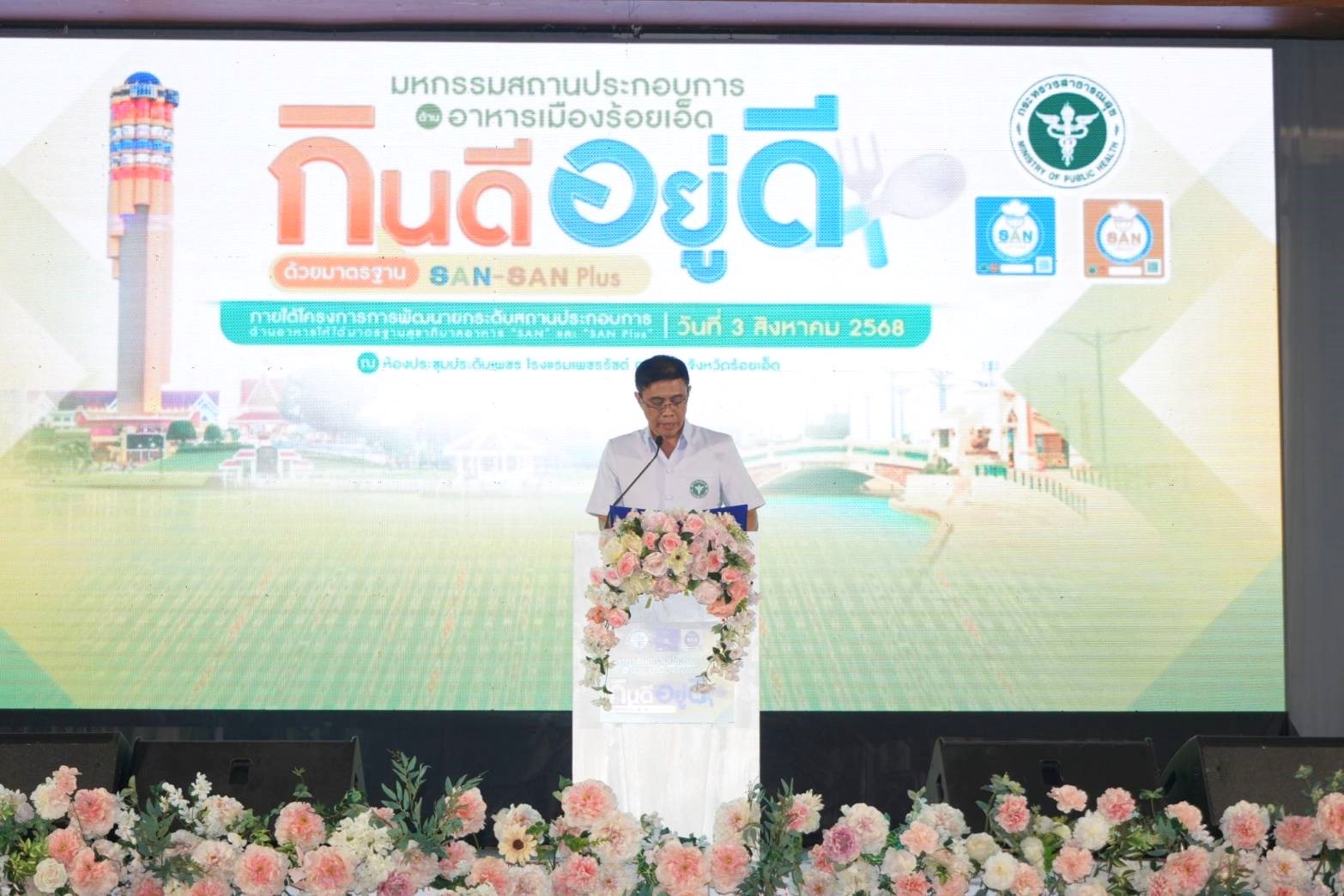ทางด้าน นายแพทย์ธิติ แสวงธรรม รองอธิบดีกรมอนามัย กล่าวว่า กรมอนามัยเป็นหน่วยงานหลักที่ขับเคลื่อนงานด้านสุขาภิบาลอาหารของประเทศเพื่อคุ้มครองสุขภาพของประชาชนให้ได้บริโภคอาหารที่สะอาดปลอดภัย ภายใต้พระราชบัญญัติการสาธารณสุข พ.ศ. 2535 และที่แก้ไขเพิ่มเติม มาตรฐานสุขาภิบาลอาหาร SAN & SAN Plus จึงเป็นสัญลักษณ์และกลไกสำคัญที่ทำให้ประชาชนมั่นใจได้ว่า หากสถานประกอบการด้านอาหารที่ได้รับป้ายรับรองมาตรฐาน SAN หรือ SAN Plus คือสถานประกอบกิจการที่ “สะอาด ปลอดภัยได้มาตรฐาน” ที่ได้รับการรับรองจากหน่วยงานราชการ ทั้งนี้ สถานประกอบการด้านอาหารในจังหวัดร้อยเอ็ดมีจำนวน ทั้งหมด 757 แห่ง ผ่านการรับรองมาตรฐานสุขาภิบาลอาหาร SAN จำนวน 382 แห่ง และ SAN Plus จำนวน 54 แห่ง รวมเป็น 436 แห่ง หรือ ร้อยละ 57.59 ซึ่งจะสามารถช่วยลดความเสี่ยงจากโรคที่เกิดจากอาหารและน้ำเป็นสื่อ รวมไปถึงสร้างความเชื่อมั่นให้ผู้บริโภค