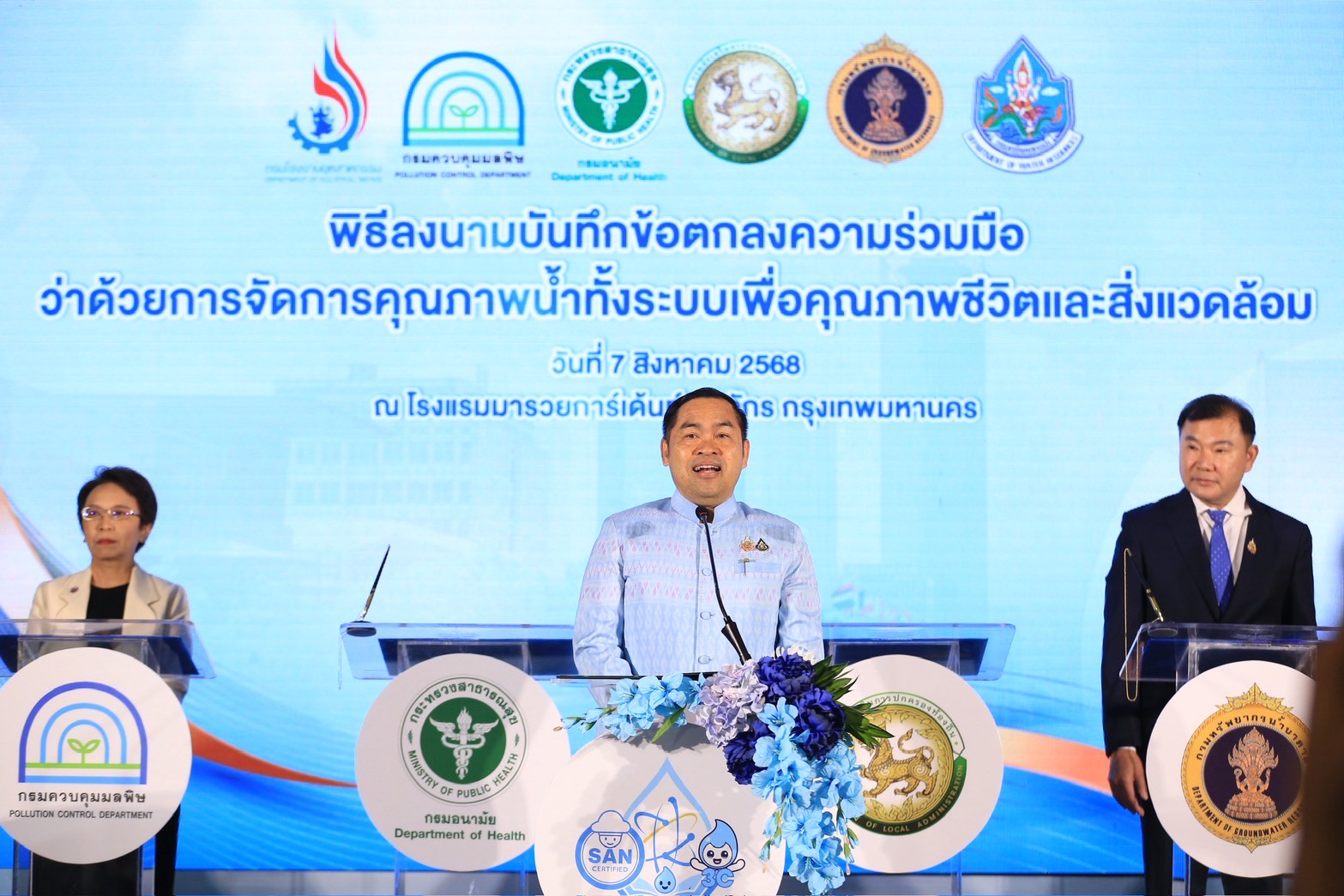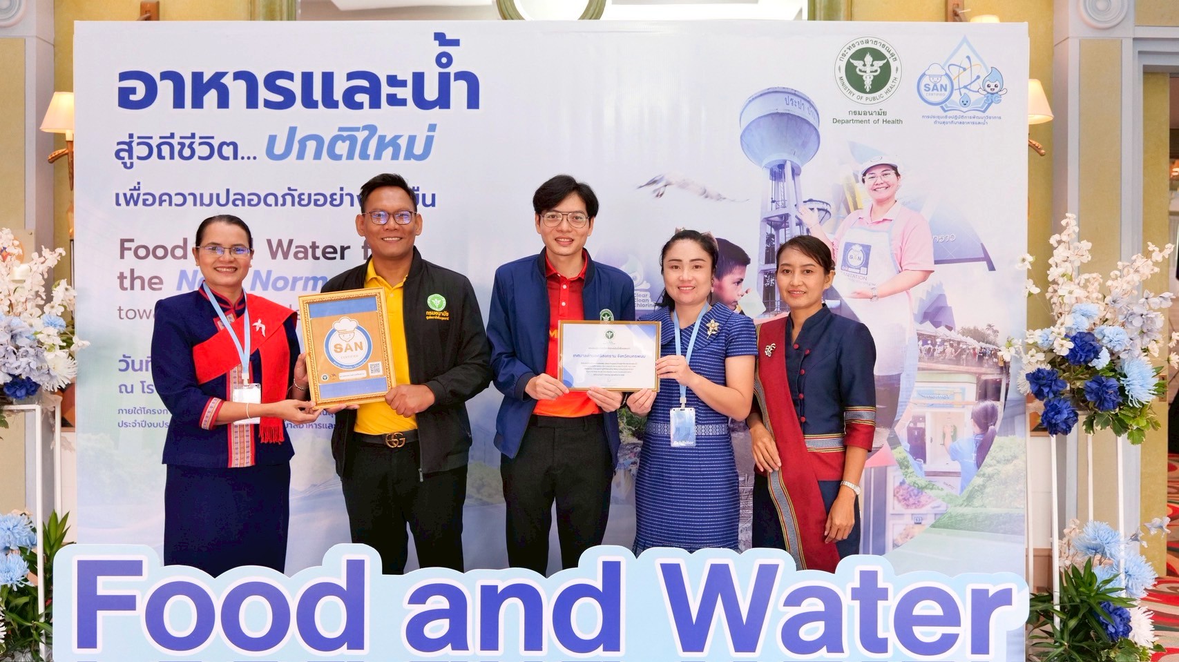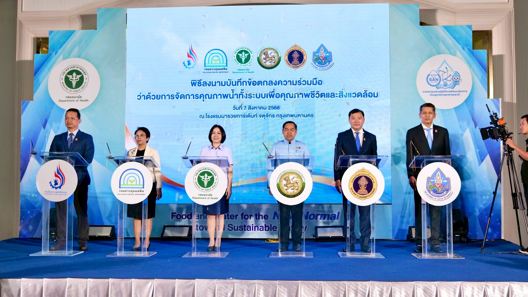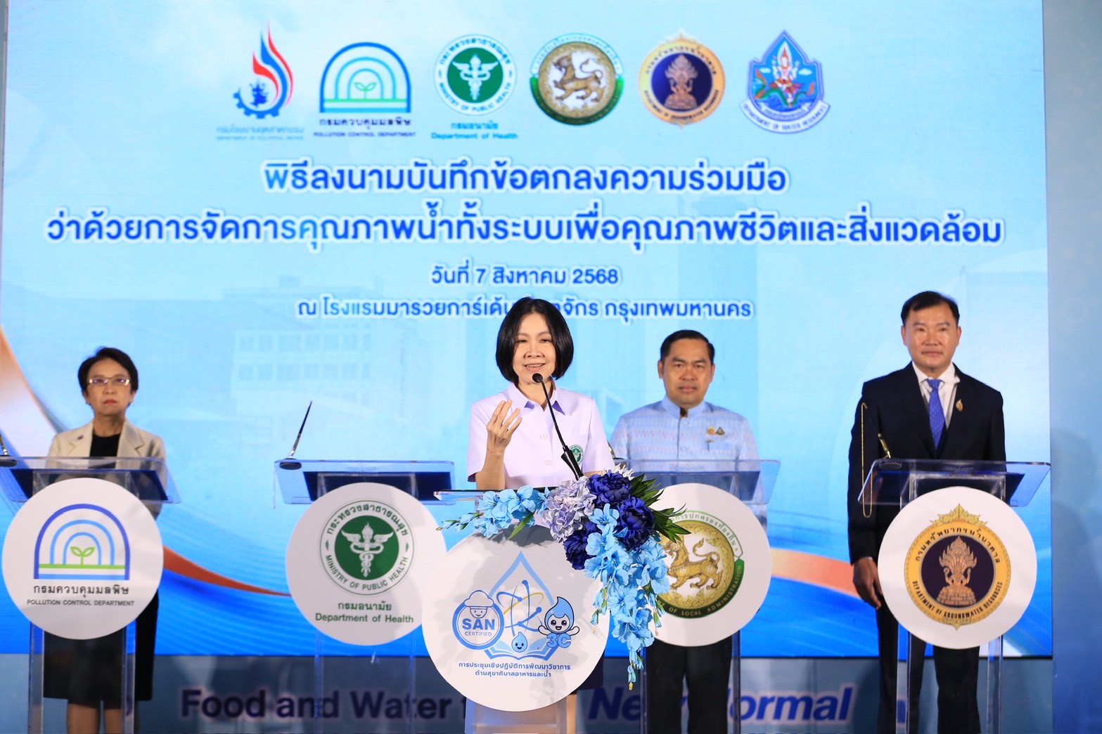 นายแพทย์ธิติ แสวงธรรม รองอธิบดีกรมอนามัย กล่าวว่า การดำเนินงานสุขาภิบาลอาหารและน้ำมีบทบาทสำคัญต่อการสร้างสภาพแวดล้อมที่ดี ในการเปลี่ยนแปลงพฤติกรรมสุขภาพของประชาชน และส่งเสริมให้ทุกกลุ่มวัยมีสุขภาพดี ซึ่งสอดคล้องกับนโยบายกระทรวงสาธารณสุขในการยกระดับมาตรฐานอาหารปลอดภัย และขับเคลื่อนเศรษฐกิจไทยให้มั่นคงยิ่งขึ้น กรมอนามัยจึงได้กำหนดมาตรฐานสุขาภิบาลอาหาร “สะอาด ปลอดภัย ได้มาตรฐาน” ภายใต้สัญลักษณ์ SAN และ SAN Plus เพื่อยกระดับคุณภาพอาหารและสร้างความเชื่อมั่นให้ผู้บริโภคทั้งในและต่างประเทศ รวมทั้งภาคธุรกิจ เช่น อุตสาหกรรมอาหารและการท่องเที่ยว ตลาดสด ร้านอาหาร หรือ Street Food สุขาภิบาลที่ดี ยังช่วยส่งเสริมภาพลักษณ์ประเทศไทยในฐานะประเทศที่มีอาหารปลอดภัยสร้างเสถียรภาพทางเศรษฐกิจของประเทศอย่างยั่งยืน และคุณภาพน้ำเป็นปัจจัยพื้นฐานของการมีสุขภาวะที่ดีให้ประชาชนสามารถเข้าถึงน้ำที่สะอาด ปลอดภัย ที่สำคัญ การยกระดับงานสุขาภิบาลจึงต้องอาศัยความร่วมมือจากทุกภาคส่วน ทั้งภาครัฐ เอกชน และประชาชน กรมอนามัยจึงร่วมกับภาคีเครือข่าย 5 หน่วยงานหลัก ได้แก่ กรมควบคุมมลพิษ กรมทรัพยากรน้ำ กรมทรัพยากรน้ำบาดาล กรมโรงงานอุตสาหกรรม และกรมส่งเสริมการปกครองท้องถิ่น ได้ร่วมลงนามบันทึกข้อตกลงความร่วมมือว่าด้วยการจัดการคุณภาพน้ำทั้งระบบเพื่อคุณภาพชีวิตและสิ่งแวดล้อม เพื่อขับเคลื่อนการยกระดับการบริหารจัดการคุณภาพน้ำ โดยอาศัยการบูรณาการด้านกฎหมาย การตรวจวิเคราะห์คุณภาพน้ำ การแลกเปลี่ยนข้อมูล การพัฒนาศักยภาพขององค์กรปกครองส่วนท้องถิ่น ตลอดจนการติดตามและประเมินผลอย่างเป็นระบบ