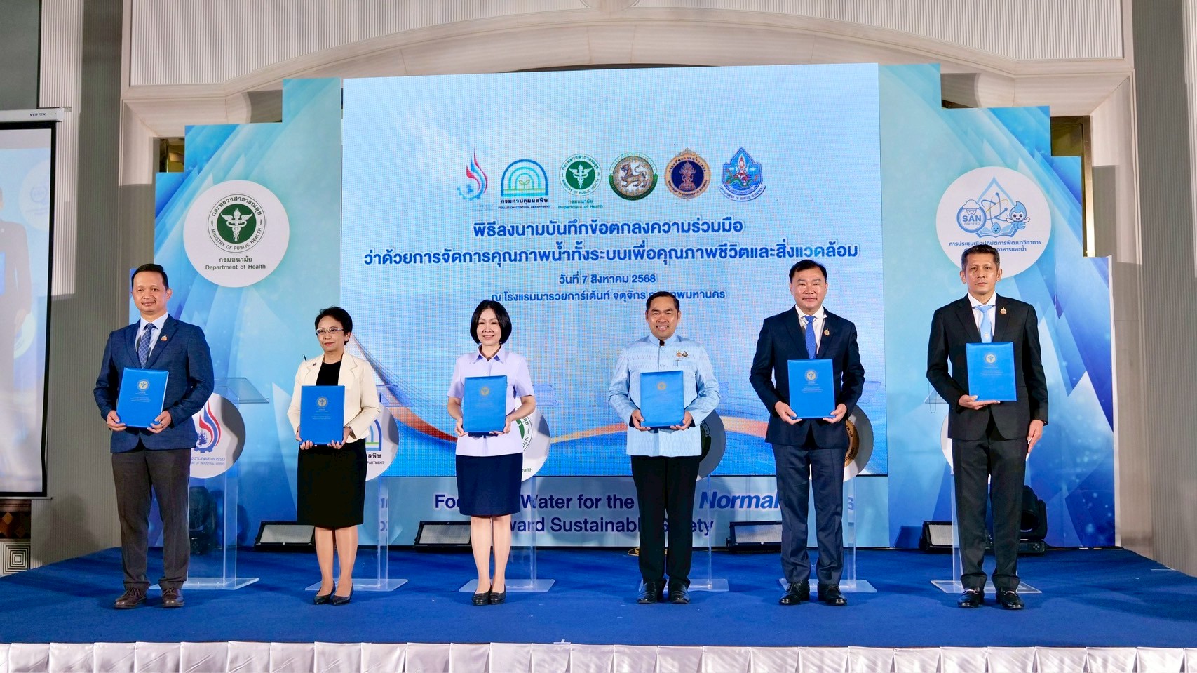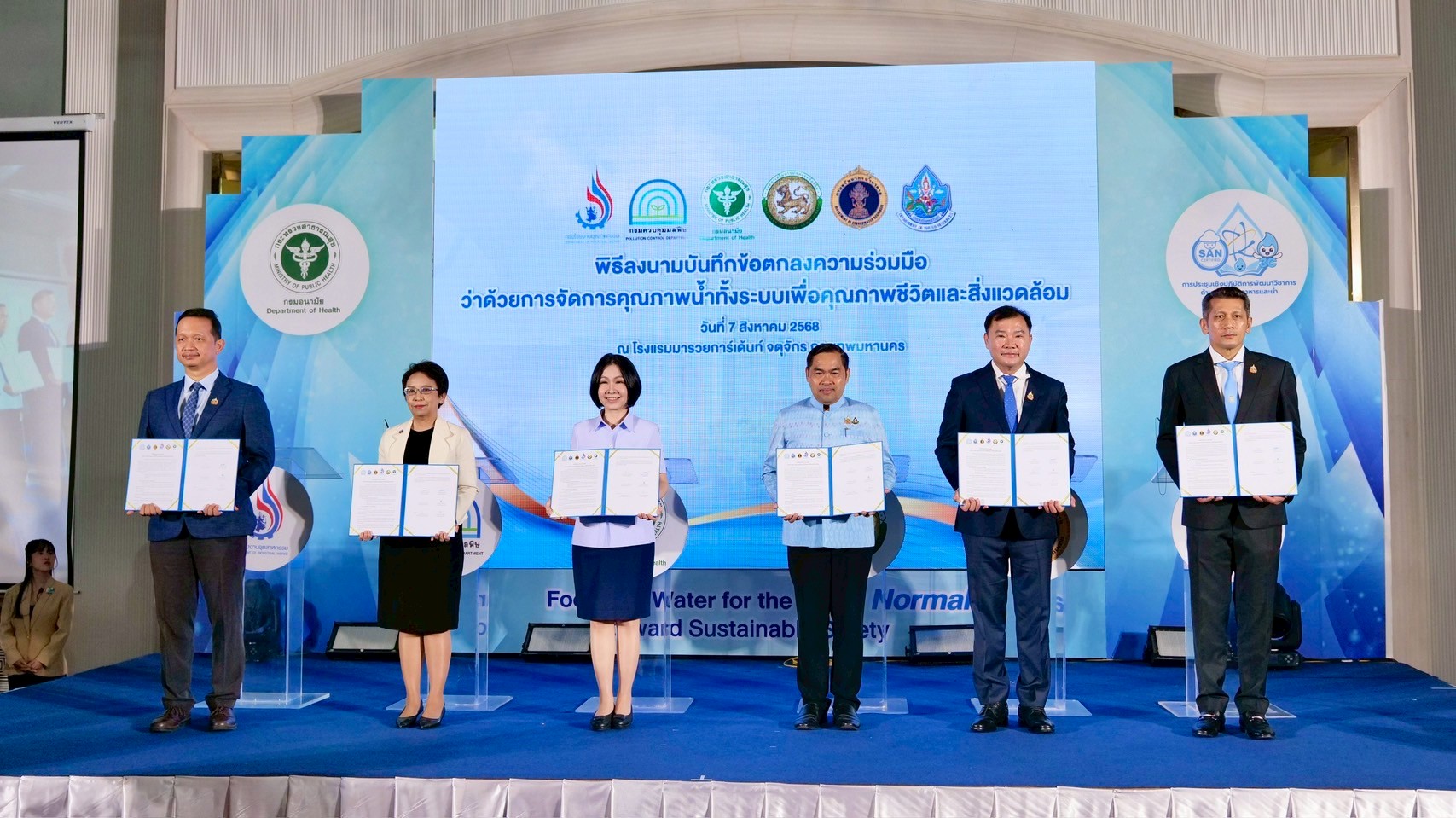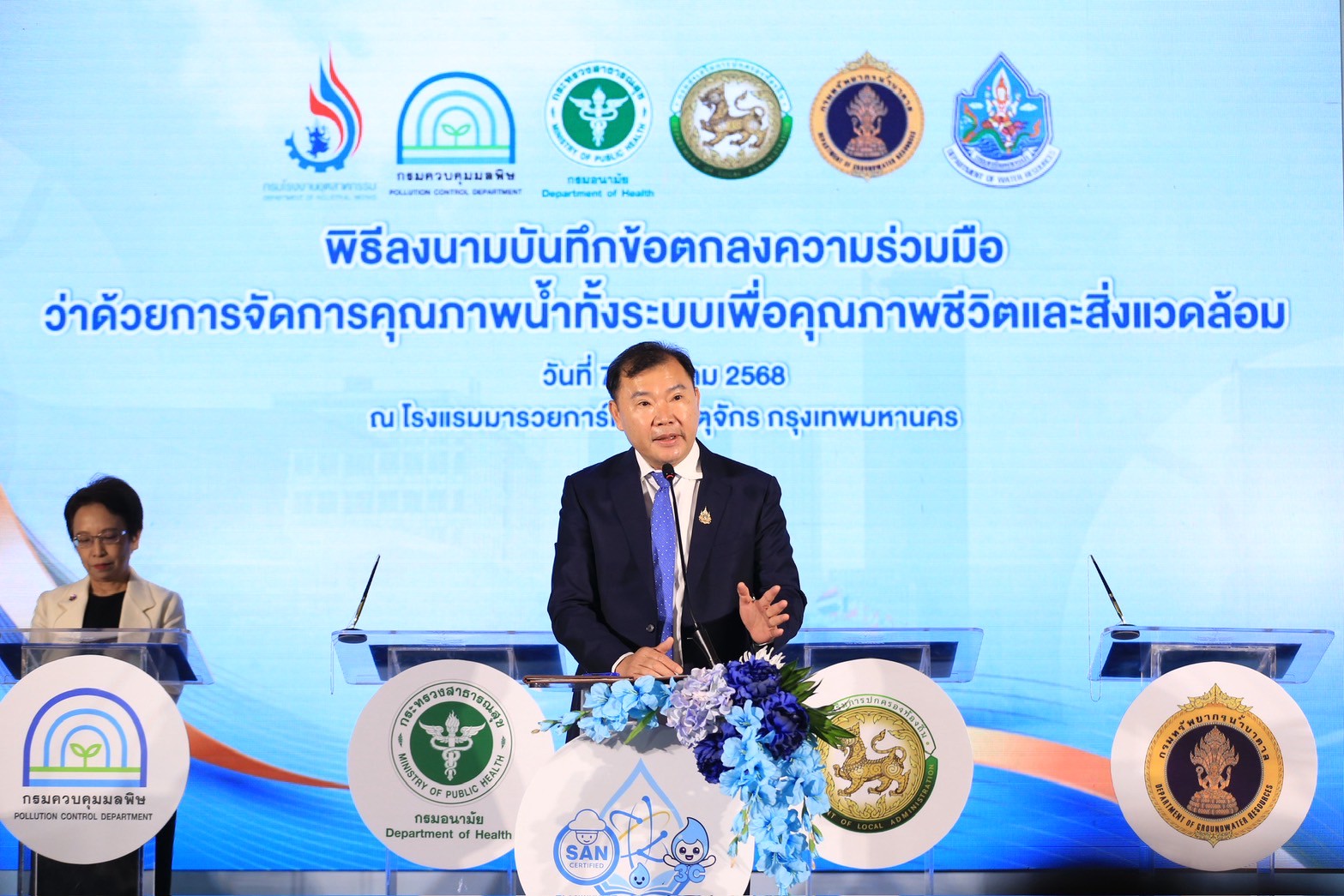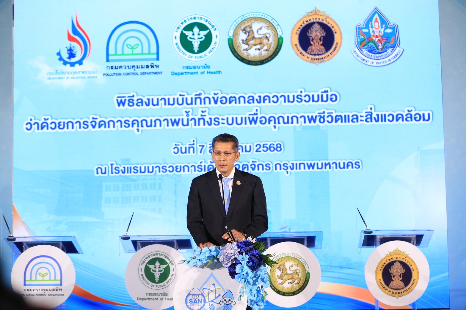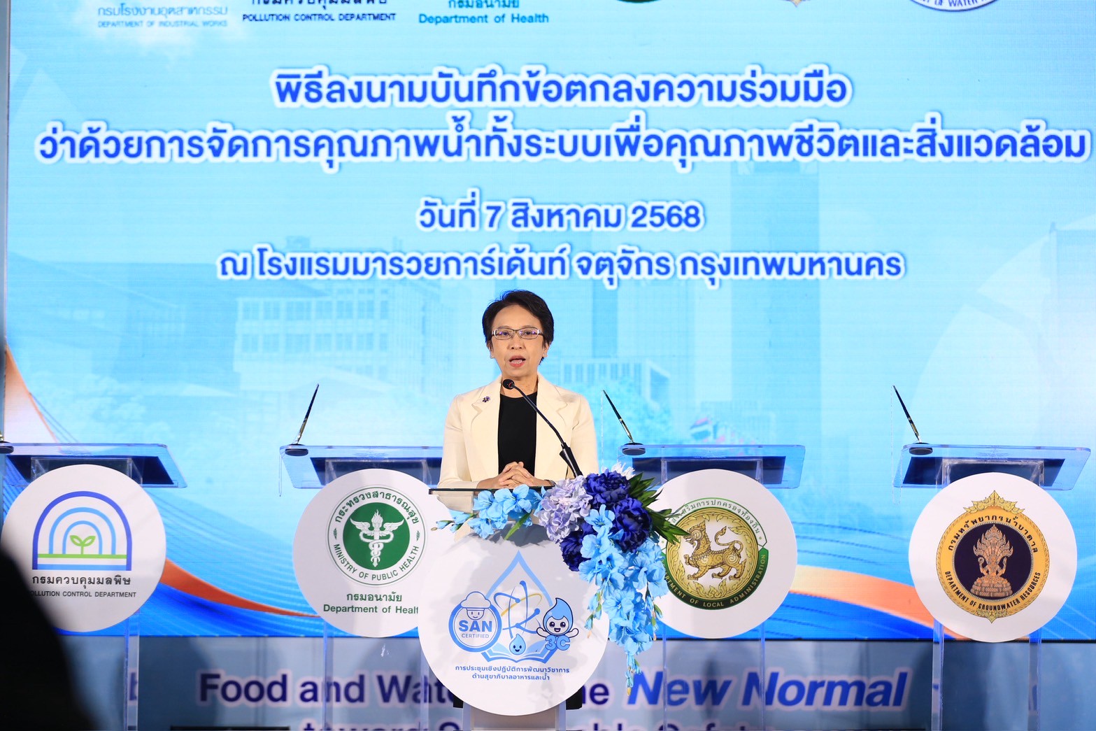 นายแพทย์ธิติ แสวงธรรม รองอธิบดีกรมอนามัย กล่าวว่า การดำเนินงานสุขาภิบาลอาหารและน้ำมีบทบาทสำคัญต่อการสร้างสภาพแวดล้อมที่ดี ในการเปลี่ยนแปลงพฤติกรรมสุขภาพของประชาชน และส่งเสริมให้ทุกกลุ่มวัยมีสุขภาพดี ซึ่งสอดคล้องกับนโยบายกระทรวงสาธารณสุขในการยกระดับมาตรฐานอาหารปลอดภัย และขับเคลื่อนเศรษฐกิจไทยให้มั่นคงยิ่งขึ้น กรมอนามัยจึงได้กำหนดมาตรฐานสุขาภิบาลอาหาร “สะอาด ปลอดภัย ได้มาตรฐาน” ภายใต้สัญลักษณ์ SAN และ SAN Plus เพื่อยกระดับคุณภาพอาหารและสร้างความเชื่อมั่นให้ผู้บริโภคทั้งในและต่างประเทศ รวมทั้งภาคธุรกิจ เช่น อุตสาหกรรมอาหารและการท่องเที่ยว ตลาดสด ร้านอาหาร หรือ Street Food สุขาภิบาลที่ดี ยังช่วยส่งเสริมภาพลักษณ์ประเทศไทยในฐานะประเทศที่มีอาหารปลอดภัยสร้างเสถียรภาพทางเศรษฐกิจของประเทศอย่างยั่งยืน และคุณภาพน้ำเป็นปัจจัยพื้นฐานของการมีสุขภาวะที่ดีให้ประชาชนสามารถเข้าถึงน้ำที่สะอาด ปลอดภัย ที่สำคัญ การยกระดับงานสุขาภิบาลจึงต้องอาศัยความร่วมมือจากทุกภาคส่วน ทั้งภาครัฐ เอกชน และประชาชน กรมอนามัยจึงร่วมกับภาคีเครือข่าย 5 หน่วยงานหลัก ได้แก่ กรมควบคุมมลพิษ กรมทรัพยากรน้ำ กรมทรัพยากรน้ำบาดาล กรมโรงงานอุตสาหกรรม และกรมส่งเสริมการปกครองท้องถิ่น ได้ร่วมลงนามบันทึกข้อตกลงความร่วมมือว่าด้วยการจัดการคุณภาพน้ำทั้งระบบเพื่อคุณภาพชีวิตและสิ่งแวดล้อม เพื่อขับเคลื่อนการยกระดับการบริหารจัดการคุณภาพน้ำ โดยอาศัยการบูรณาการด้านกฎหมาย การตรวจวิเคราะห์คุณภาพน้ำ การแลกเปลี่ยนข้อมูล การพัฒนาศักยภาพขององค์กรปกครองส่วนท้องถิ่น ตลอดจนการติดตามและประเมินผลอย่างเป็นระบบ