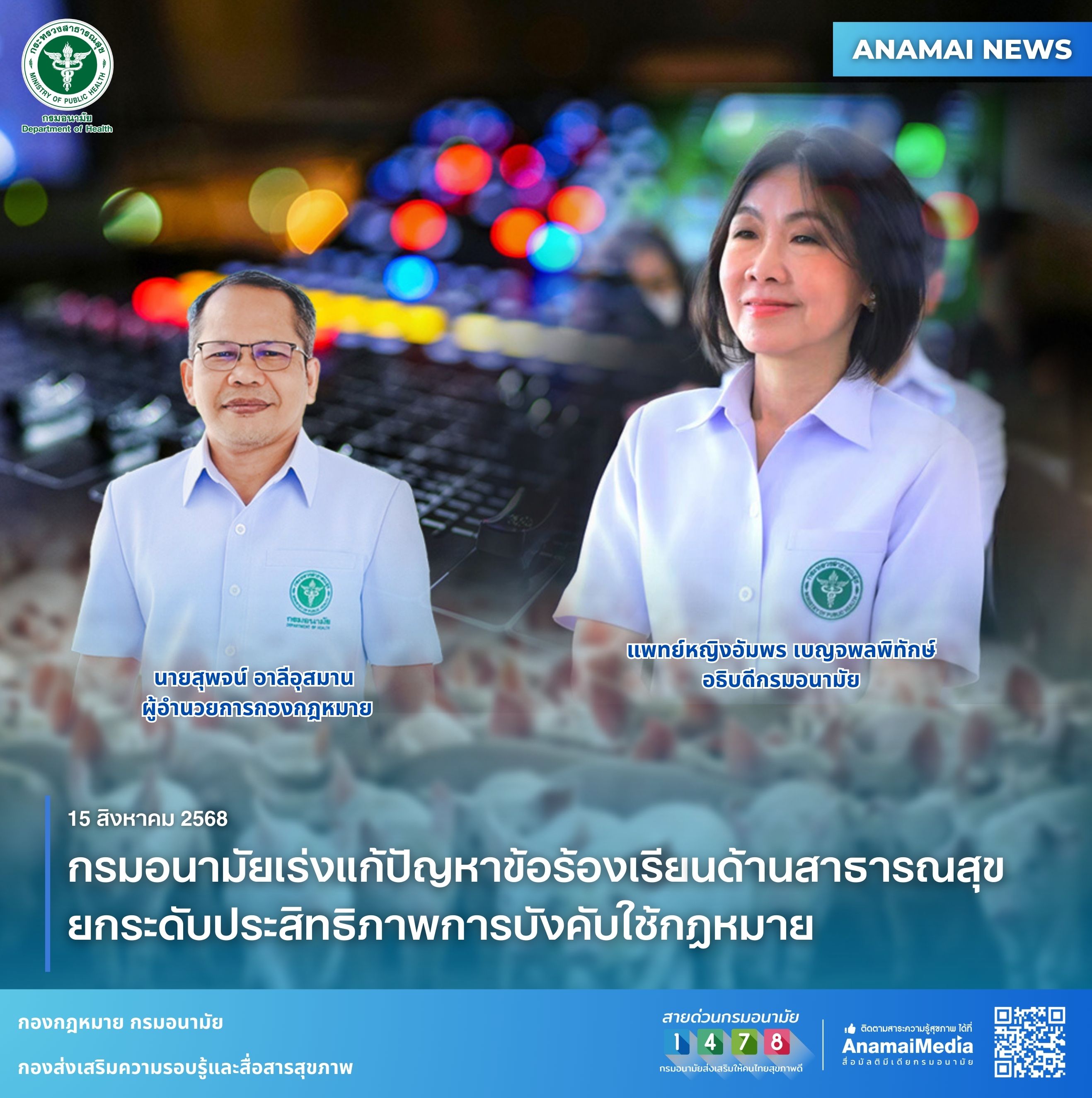 กรมอนามัย กระทรวงสาธารณสุข เผยปัญหาการบังคับใช้กฎหมายการสาธารณสุขล่าช้า ส่งผลประชาชนเดือดร้อนรำคาญยาวนาน โดยเฉพาะประเด็นกลิ่นเหม็นจากฟาร์มเลียงสัตว์และเสียงดังจากสถานบันเทิง พร้อมเร่งพัฒนาศักยภาพเจ้าพนักงานท้องถิ่นให้เข้าใจหลักกฎหมาย หวังแก้ไขปัญหาได้อย่างยั่งยืน