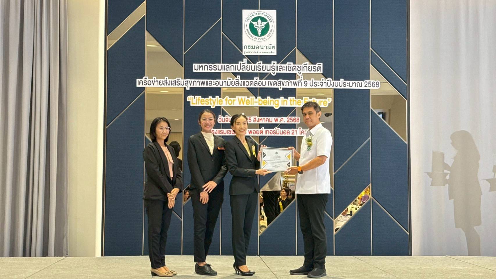 วันนี้ (25 สิงหาคม 2568) แพทย์หญิงอัมพร เบญจพลพิทักษ์ อธิบดีกรมอนามัย เปิดงานมหกรรมแลกเปลี่ยนเรียนรู้และเชิดชูเกียรติเครือข่ายส่งเสริมสุขภาพและอนามัยสิ่งแวดล้อม เขตสุขภาพที่ 9 ภายใต้หัวข้อ “Lifestyle for Well-being in the Future” โดยมี นายแพทย์ธิติ แสวงธรรม รองอธิบดีกรมอนามัย พร้อมด้วย นายแพทย์พีระยุทธ สานุกูล ผู้อำนวยการศูนย์อนามัยที่ 9 นครราชสีมา คณะผู้บริหาร กรมอนามัย ภาคีเครือข่าย เข้าร่วมงาน ณ โรงแรมเซนเตอร์พอยต์ เทอมินอล 21 จังหวัดนครราชสีมา
