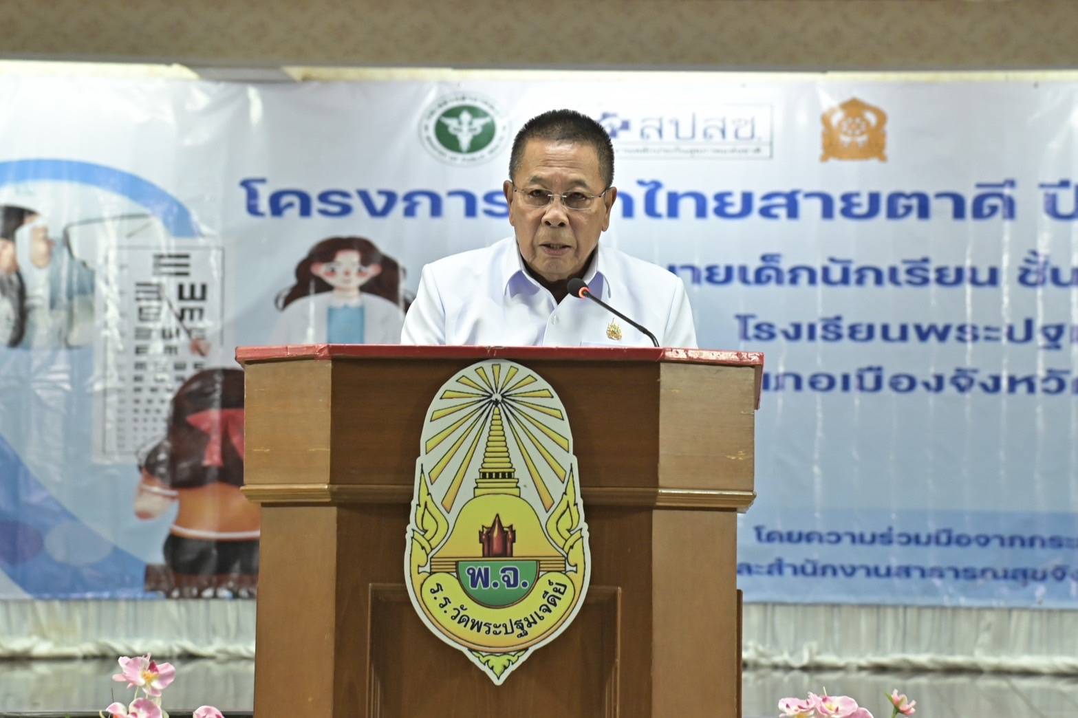 นายแพทย์วิโรจน์ รัตนอมรสกุล นายแพทย์สาธารณสุขจังหวัดนครปฐม กล่าวว่า จังหวัดนครปฐมพร้อมรับนโยบายของกระทรวงสาธารณสุขร่วมกับภาคีเครือข่าย ดำเนินงานโครงการเด็กไทยสายตาดี ในส่วนของจังหวัดนครปฐมก็ได้มีการดำเนินงานตามนโยบายของกระทรวงสาธารณสุข โดยในปีการศึกษา 2567 มีนักเรียน ป.1 ได้รับการคัดกรองสายตา จำนวน 5,766 คน หรือ ร้อยละ 51.73 มีภาวะสายตาผิดปกติ จำนวน 525 คน หรือ ร้อยละ 9.11 ได้รับแว่นสายตา 278 คน หรือ ร้อยละ 52.95 และส่วนในปีการศึกษา 2568 ภาคเรียนที่ 1 ก็ได้มีการคัดกรองสายตาไปแล้ว จำนวน 6,777 คน หรือ ร้อยละ 63.03 มีภาวะสายตาผิดปกติ จำนวน 810 คน หรือ ร้อยละ 11.95 ทั้งนี้อยู่ระหว่างนำเด็กที่มีภาวะสายผิดปกติเข้าสู่ระบบบริการตรวจวัดสายตาและตัดแว่นสายตา สำหรับการจัดกิจกรรมในครั้งนี้ เพื่อให้นักเรียนได้รับการตรวจคัดกรองสายตา ได้รับการตรวจวินิจฉัยโดยจักษุแพทย์ และได้รับแว่นตาสายตาในกรณีรายที่พบความผิดปกติต่อไป