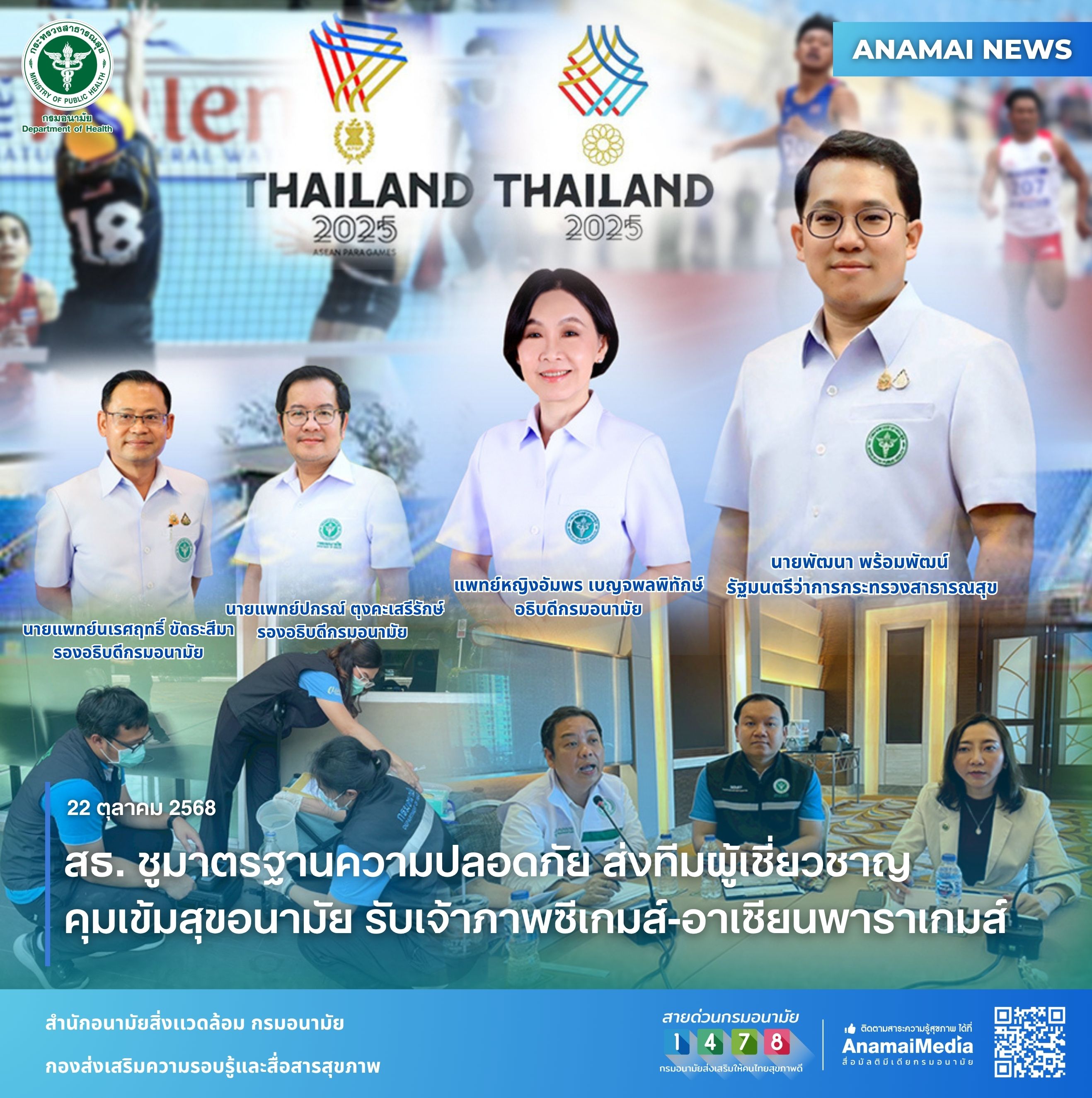 นายพัฒนา พร้อมพัฒน์ รัฐมนตรีว่าการกระทรวงสาธารณสุข กล่าวว่า ตามที่ประเทศไทยได้รับเกียรติให้เป็นเจ้าภาพจัดการแข่งขันมหกรรมกีฬาสำคัญ 2 รายการ ได้แก่ กีฬาซีเกมส์ครั้งที่ 33 (33rd Southeast Asian Games) ระหว่างวันที่ 9 – 20 ธันวาคม 2568 ณ กรุงเทพมหานคร ชลบุรี และสงขลา และการแข่งขันกีฬาอาเซียนพาราเกมส์ ครั้งที่ 13 (13th ASEAN Para Games) ระหว่างวันที่ 20 – 26 มกราคม 2569 ณ จังหวัดนครราชสีมา ซึ่งคาดว่าจะมีนักกีฬา เจ้าหน้าที่ และนักท่องเที่ยวจาก 11 ประเทศสมาชิกอาเซียนเดินทางเข้ามาในประเทศไทยมากกว่า 20,000 คน กรมอนามัยในฐานะหน่วยงานหลักที่รับผิดชอบดูแลด้านสุขอนามัยตลอดการแข่งขัน ตระหนักถึงความสำคัญของสุขลักษณะของสถานที่จัดการแข่งขันและที่พัก จึงจำเป็นต้องให้ความสำคัญ ด้านสุขอนามัยและอนามัยสิ่งแวดล้อมที่ถูกต้องและเหมาะสม เพื่อป้องกันความเสี่ยง หรือผลกระทบต่อสุขภาพอนามัยของประชาชนทั้งนักกีฬา เจ้าหน้าที่ รวมถึงนักท่องเที่ยวเพื่อเตรียมความพร้อม
