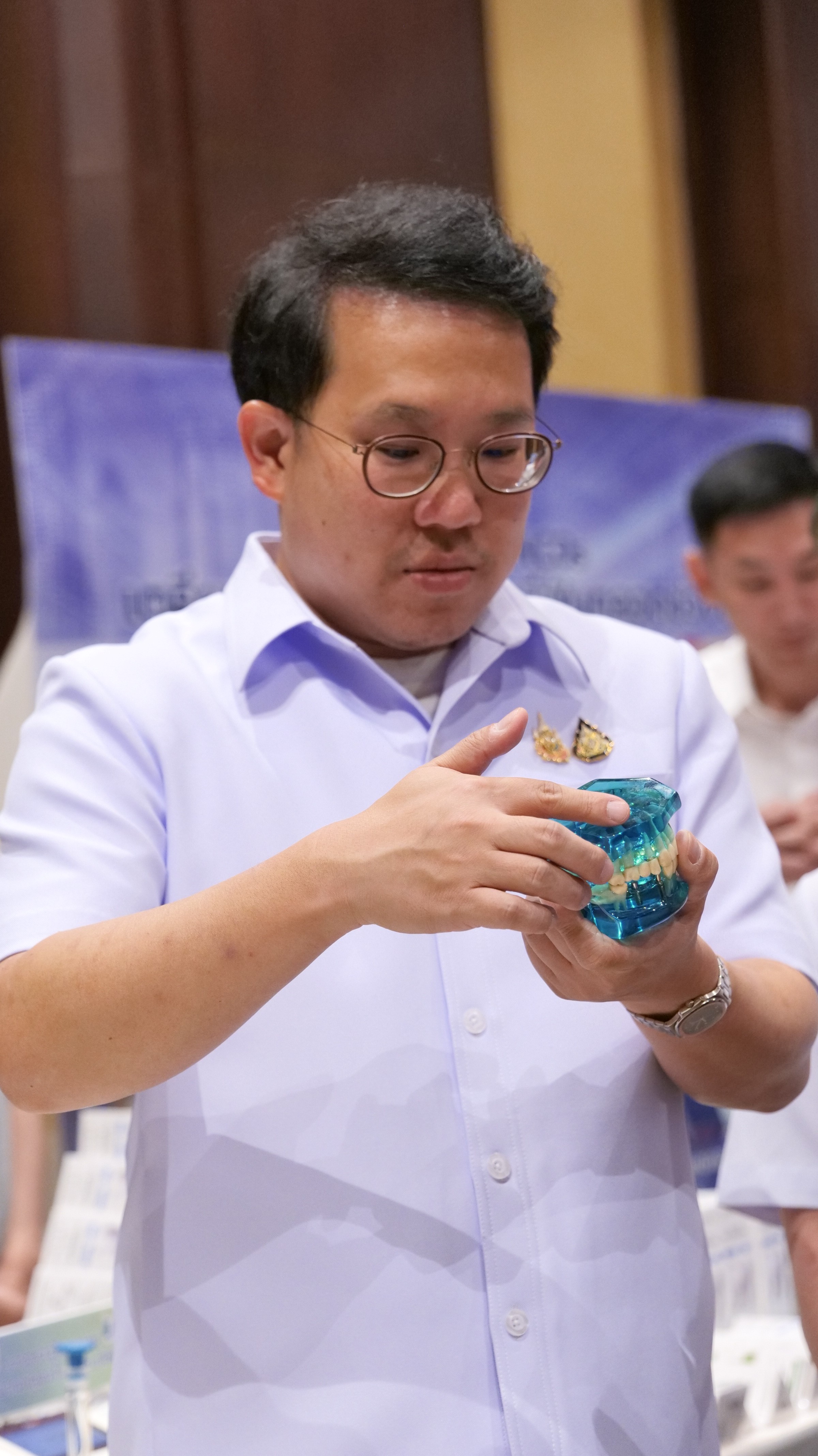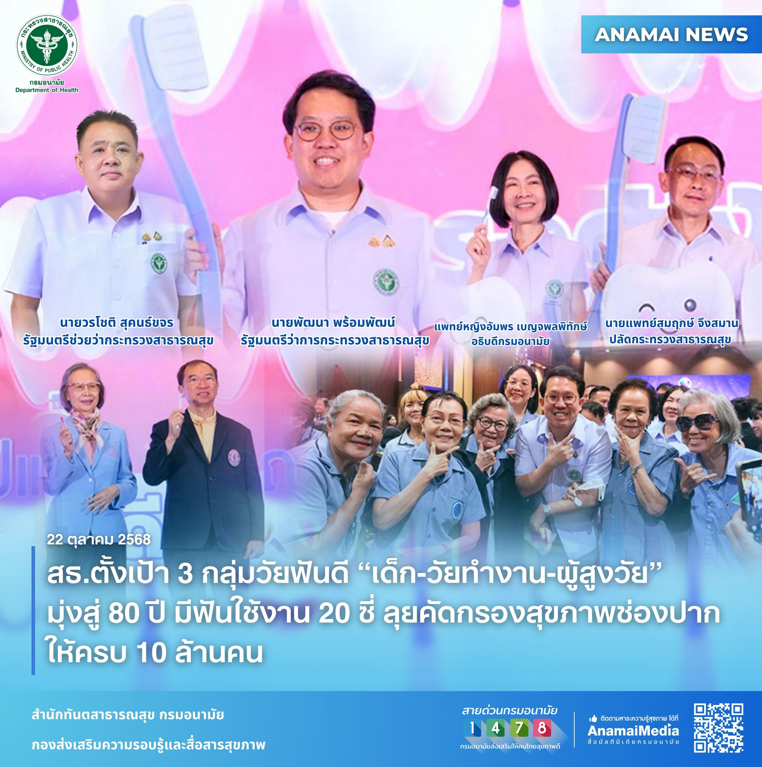 นายพัฒนา พร้อมพัฒน์ รัฐมนตรีว่าการกระทรวงสาธารณสุข กล่าวว่า กระทรวงสาธารณสุข ได้กำหนดนโยบายและแผนงานสำคัญเพื่อส่งเสริมสุขภาพช่องปากและแก้ไขปัญหาฟัน ทั้งในเด็ก วัยทำงานและผู้สูงอายุ โดยมี โครงการเด่น เช่น "Sandbox จังหวัดเด็กฟันดี" เพื่อลดปัญหาฟันผุในเด็ก นโยบาย "80 ปี ฟันดี 20 ซี่" เพื่อดูแลสุขภาพฟันผู้สูงอายุ และการส่งเสริมให้ประชาชนทุกกลุ่มวัยเข้าถึงบริการทันตกรรมผ่านสิทธิหลักประกันสุขภาพต่าง ๆ รวมถึงโครงการ “โครงการยิ้มคนไทย ไร้ฟันผุ”เพื่อรณรงค์ให้ความรู้เรื่องการดูแลช่องปากอย่างถูกวิธีเพื่อคุณภาพชีวิตที่ดีขึ้น นอกจากนี้กระทรวงได้กำหนดมาตรการ ดังนี้ 1) เพิ่มฟันดีไม่มีผุ ในเด็ก อายุ 0 -12 ปี ด้วยการวางระบบเฝ้าระวังและเพิ่มการเข้าถึงบริการส่งเสริมป้องกันเข้มข้น 2) ลดปริทันต์อักเสบในวัยทำงานและสูงอายุด้วยการคัดกรองและดูแลด้านปริทันต์ โดยทันตบุคลากร ร่วมกับ NCD Clinic 3) ส่งเสริมให้เกิดความรอบรู้ ด้านสุขภาพช่องปากด้วยการแปรงฟัน 2-2-2 4) จัดบริการทันตกรรมเชิงรุกแบบรัฐร่วมเอกชน เช่น รถทันตกรรม และ 5) ส่งเสริมให้ประชาชนใช้ App “รักยิ้ม” ในการคัดกรองสุขภาพช่องปากเบื้องต้น ตั้งเป้าหมายผลงาน QUICK WIN 4 เดือน ได้แก่ 1) ประชาชนได้รับการคัดกรองสุขภาพช่องปาก 10 ล้านครั้ง 2) เด็ก อายุ 0 -12 ปี ฟันดีไม่มีผุ 700,000 คน และ 3) ประชาชนมีพฤติกรรมแปรงฟัน 2 2 2 ร้อยละ 80