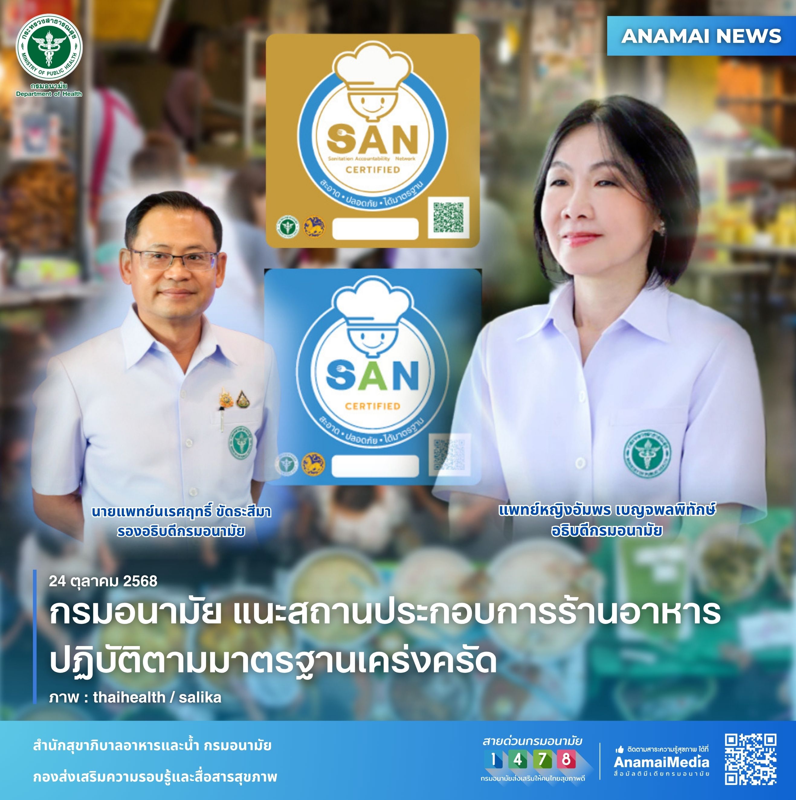 นายแพทย์นเรศฤทธิ์ ขัดธะสีมา รองอธิบดีกรมอนามัย กล่าวเพิ่มเติมว่า กรมอนามัย กระทรวงสาธารณสุขยังได้ยกระดับมาตรฐานสุขาภิบาลอาหารที่สะอาด ปลอดภัย SAN หรือ SAN plus เพื่อผลักดันสถานประกอบกิจการด้านอาหารได้ดำเนินการตามหลักการสุขาภิบาลอาหาร อาทิ การจัดการสถานที่จำหน่ายอาหาร เช่น บริเวณที่ปรุงประกอบอาหารบริเวณที่รับประทานอาหาร อาหารและวัตถุดิบมีคุณภาพ จัดวางอาหารสูงจากพื้นไม่น้อยกว่า 60 เซนติเมตร มีการปกปิดอาหารเพื่อป้องกันการปนเปื้อน ดูแลคุณภาพน้ำในการปรุงประกอบอาหาร ภาชนะอุปกรณ์และเครื่องใช้ต้องทำความสะอาด และจัดเก็บถูกสุขลักษณะ นอกจากนี้ ผู้ประกอบการและผู้สัมผัสอาหารต้องผ่านการอบรม รวมทั้ง มีสุขวิทยาส่วนบุคคลที่ดี เช่น สวมผ้ากันเปื้อน ผ้าคลุมผม ไม่สวมเครื่องประดับ เล็บสั้นสะอาด เป็นต้น และมีมาตรการป้องกันสัตว์และพาหะนำโรคเข้ามาในสถานประกอบกิจการ ประชาชนสามารถเลือกรับบริการสถานประกอบกิจการด้านอาหาร โดยสังเกตจากป้ายสัญลักษณ์ SAN หรือ SAN plus