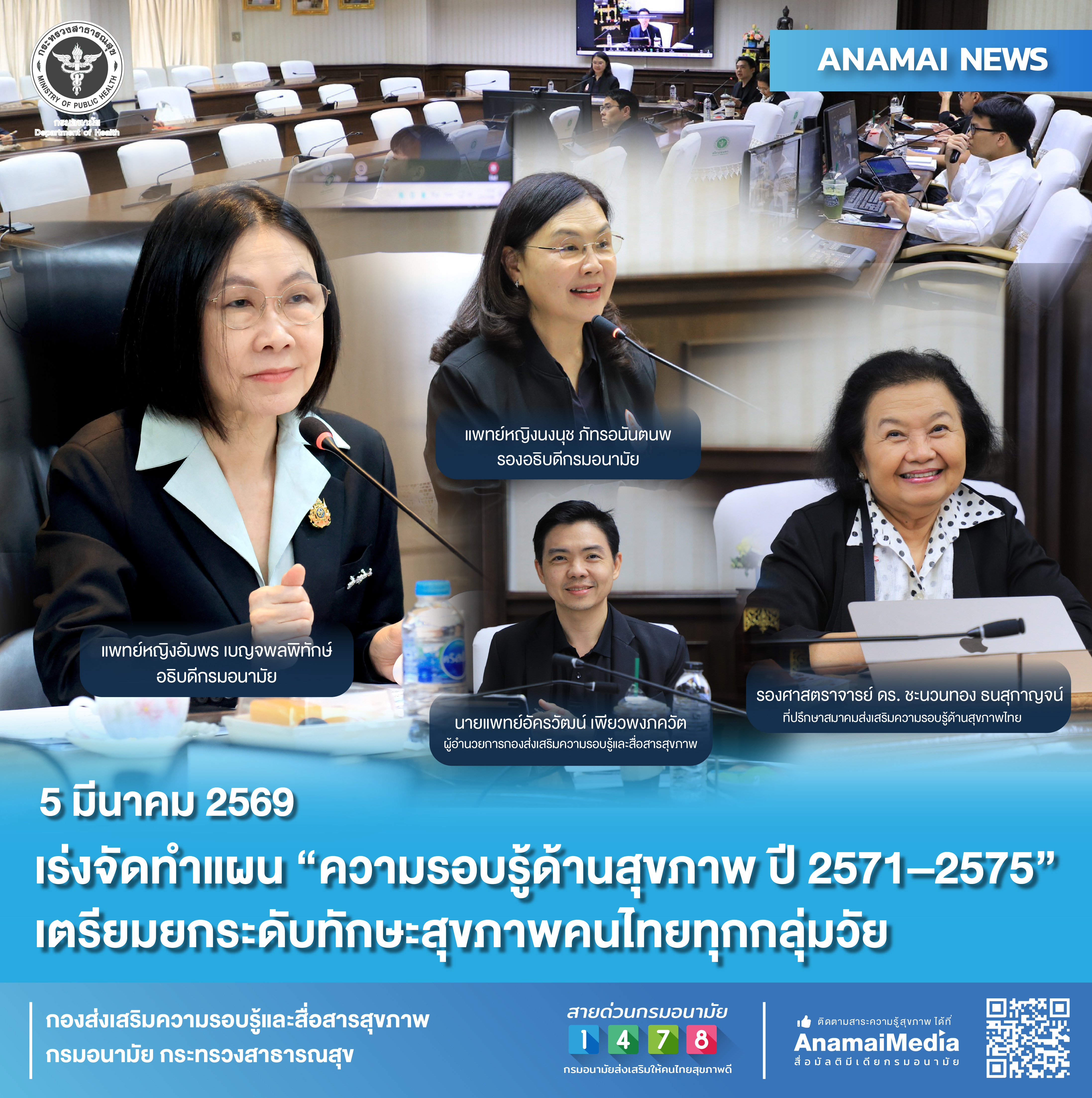 แพทย์หญิงอัมพร เบญจพลพิทักษ์ อธิบดีกรมอนามัย เปิดเผยว่า แผนปฏิบัติการด้านการสร้างความรอบรู้ด้านสุขภาวะ การป้องกันและควบคุมปัจจัยเสี่ยงที่คุกคามสุขภาวะแห่งชาติฉบับใหม่ ได้กำหนดทิศทาง 4 ประเด็นสำคัญได้แก่ 1) ปรับพฤติกรรมสุขภาพและสร้างทักษะสุขภาพตลอดช่วงชีวิต ครอบคลุมเด็ก วัยเรียน วัยทำงาน ผู้สูงอายุ และกลุ่มเปราะบาง 2) ยกระดับระบบบริการและชุมชนสู่ “องค์กรรอบรู้ด้านสุขภาพ” ทั้งโรงพยาบาลสถานประกอบการ และสถานบริการปฐมภูมิ 3) พัฒนาระบบเฝ้าระวังสื่อสุขภาพและข้อมูลเท็จ (Misinformation) เพื่อให้ประชาชนสามารถคิดวิเคราะห์ รู้เท่าทันสื่อ ในยุคดิจิทัล 4) ผลักดันนโยบายการสร้างความรอบรู้ด้านสุขภาวะการป้องกันและควบคุมปัจจัยเสี่ยงที่คุกคามสุขภาวะแห่งชาติ พ.ศ. 2571–2575 ให้เป็นวาระร่วมทุกหน่วยงานโดยบูรณาการส่วนกลาง จังหวัด ท้องถิ่น ภาครัฐ เอกชน และภาคประชาสังคม ซึ่งแผนฉบับใหม่นี้จะเข้าสู่กระบวนการรับฟังความเห็นในปี 2569 ก่อนเสนอคณะกรรมการสร้างเสริมความรอบรู้และสื่อสารสุขภาพแห่งชาติพิจารณา และคณะรัฐมนตรีพิจารณา คาดว่าจะช่วยยกระดับทักษะสุขภาพของคนไทยรับมือโรค NCDs สังคมสูงวัย และภัยสุขภาพยุคใหม่ในโลกยุดิจิทัลได้อย่างมีประสิทธิภาพ