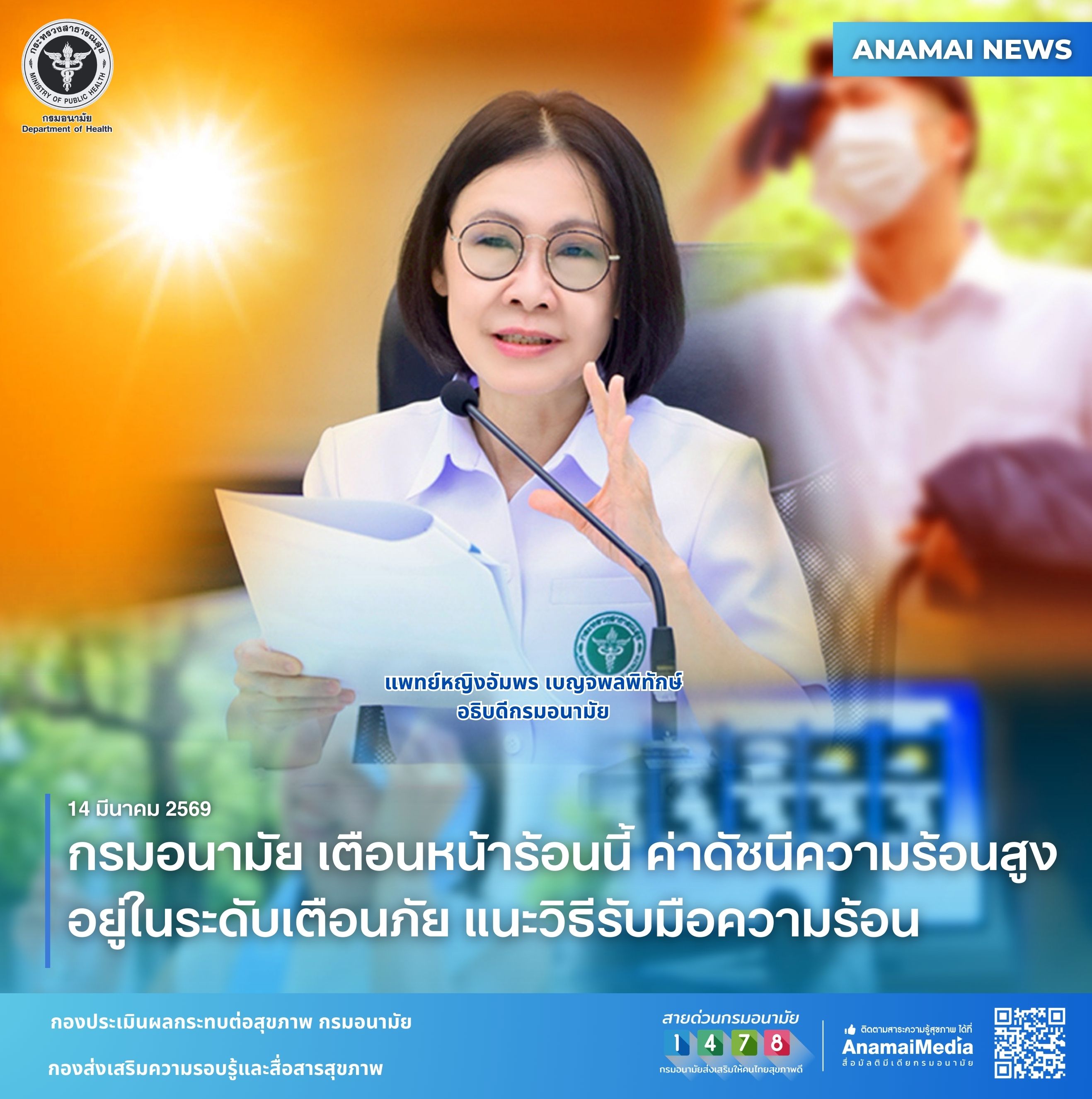 แพทย์หญิงอัมพร เบญจพลพิทักษ์ อธิบดีกรมอนามัย กล่าวว่า ปัจจุบันโลกกำลังเผชิญความท้าทายด้านอนามัยสิ่งแวดล้อมจากการเปลี่ยนแปลงสภาพภูมิอากาศ (Climate Change) ส่งผลให้เกิดสภาพอากาศสุดขั้วมากขึ้น ทั้งอากาศร้อนจัด ฝุ่นละอองขนาดเล็ก PM2.5 และมลพิษทางสิ่งแวดล้อม ซึ่งกระทบต่อสุขภาพและคุณภาพชีวิตของประชาชน ทั้งนี้ กรมอุตุนิยมวิทยาได้เฝ้าระวังสถานการณ์ค่าดัชนีความร้อน (Heat Index) ซึ่งเป็นค่าความร้อนที่ ‘ร่างกายรู้สึกได้จริง’ หรือ Feel like ใช้บ่งชี้ระดับความเสี่ยงที่ร่างกายอาจได้รับผลกระทบจากความร้อน โดยคำนวณจากอุณหภูมิและความชื้นสัมพัทธ์ ซึ่งต่างจากอุณหภูมิทั่วไป ที่วัดเพียงระดับความร้อนหรือความเย็นของอากาศ โดยในปีที่ผ่านมา ประเทศไทยมีค่าดัชนีความร้อนสูงสุดถึง 59.5 องศาเซลเซียส และมีผู้เสียชีวิตจากความร้อน จำนวน 21 คน ขณะที่ปี 2569 คาดว่าสถานการณ์ความร้อนจะมีแนวโน้มรุนแรงกว่าปีที่ผ่านมา โดยค่าดัชนีความร้อนอาจอยู่ในระดับเตือนภัย (33.0 – 41.9 °C) ถึงอันตรายมาก (มากกว่าหรือเท่ากับ 52.0 °C) ในช่วงเดือนเมษายน - พฤษภาคม โดยเฉพาะในภาคเหนือ ภาคตะวันออกเฉียงเหนือ และภาคกลาง ซึ่งอาจทำให้เกิดโรคจากความร้อน เช่น ผื่น ตะคริว ลมแดด เพลียแดด และฮีทสโตรก ซึ่งเป็นภาวะที่รุนแรงที่สุดและอาจทำให้เสียชีวิตได้