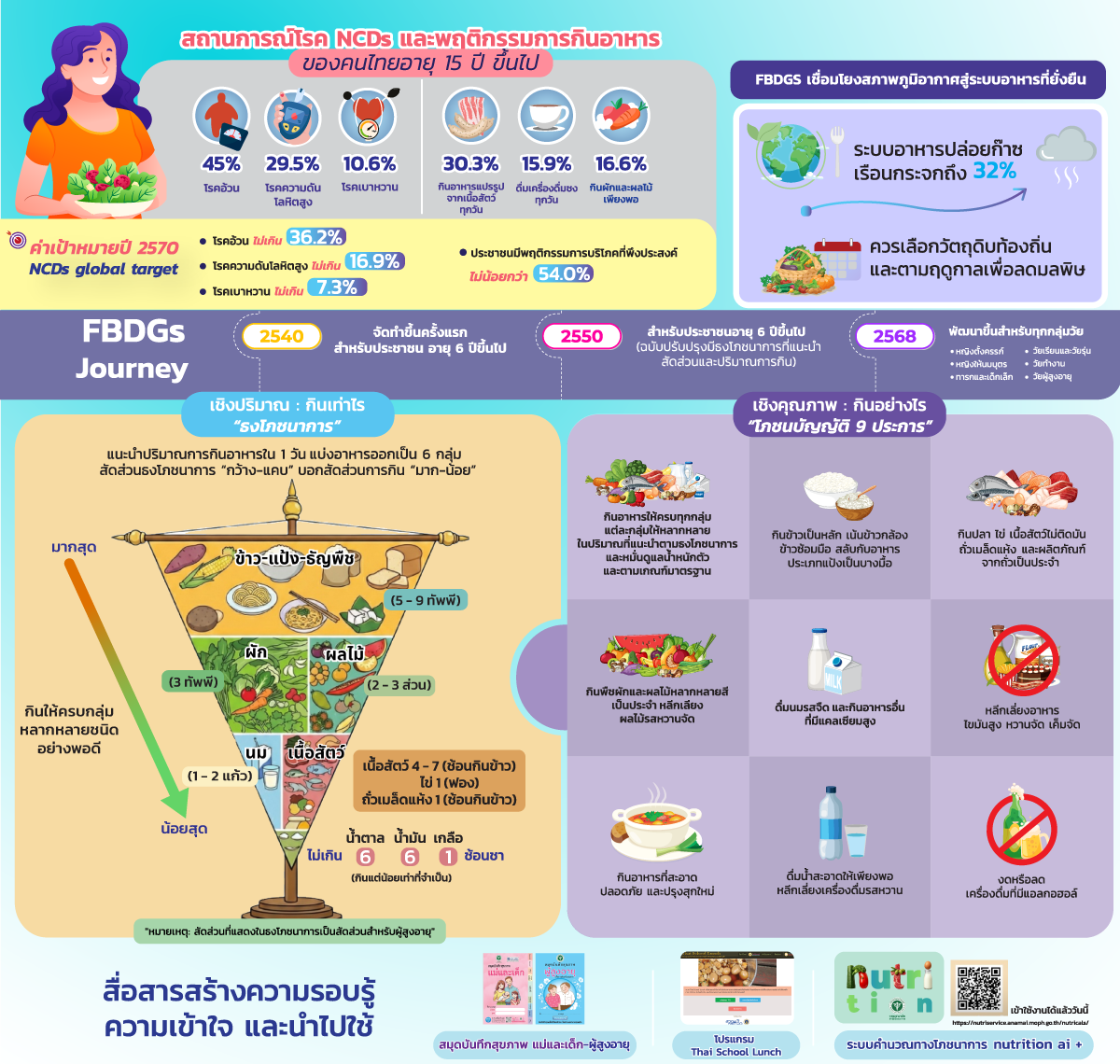 แพทย์หญิงอัมพร เบญจพลพิทักษ์ อธิบดีกรมอนามัย กล่าวว่า กรมอนามัยได้พัฒนา ข้อปฏิบัติการกินอาหารเพื่อสุขภาพที่ดี (Food-Based Dietary Guidelines: FBDGs) ฉบับปี 2568 ให้ทันต่อสถานการณ์โลก FBDGs ฉบับใหม่นี้ได้จัดทำแยกตามกลุ่มวัย ซึ่งครอบคลุมทุกช่วงวัยตั้งแต่แม่ตั้งครรภ์จนถึงผู้สูงอายุ โดยเน้นความสมดุลระหว่าง "สุขภาพดี" และ "ความยั่งยืนของระบบอาหาร" (Sustainability) ส่งเสริมการใช้วัตถุดิบในท้องถิ่น กินตามฤดูกาล เพื่อลดการสูญเสียอาหารและสนับสนุนเกษตรกรไทย หัวใจสำคัญของการกินดี มี 2 ด้าน คือด้านปริมาณที่เรียกว่า"ธงโภชนาการ" ซึ่งบอกให้ทราบว่าใน 1 วัน กินเท่าไรจึงพอดี แนะนำการกินอาหาร 6 กลุ่ม ในสัดส่วนที่เหมาะสม อาหารกลุ่มข้าว-แป้ง ธัญพืชไม่ขัดสีกินมากที่สุด รองลงมือคือกินผักและผลไม้หลากสี กินเนื้อสัตว์ไม่ติดมัน ไข่ และถั่วเมล็ดแห้ง ในสัดส่วนที่พอเหมาะ ดื่มนมรสจืดวันละ 2 แก้ว กลุ่มน้ำมัน น้ำตาล และเกลือควรกินให้น้อยที่สุด สำหรับด้านคุณภาพ หรือ "โภชนบัญญัติ 9 ประการ" เป็นคำแนะนำการกินอย่างไรให้สุขภาพดี เช่น การกินอาหารให้ครบทุกกลุ่ม กินข้าวเป็นหลักและเลือกข้าวไม่ขัดสี กินอาหารที่เป็นแหล่งโปรตีนจากปลา ไข่ ถั่วเมล็ดแห้ง กินผักและผลไม้หลายสีเป็นประจำ ดื่มนมจืด กินอาหารสะอาดและปรุงสุกใหม่ ดื่มน้ำสะอาดให้เพียงพอ ลดอาหารหวาน มัน เค็ม และหลีกเลี่ยงเครื่องดื่มแอลกอฮอล์ ซึ่งมีส่วนช่วยลดความเสี่ยงของโรคไม่ติดต่อเรื้อรัง และส่งเสริมสุขภาพที่ดีในระยะยาว