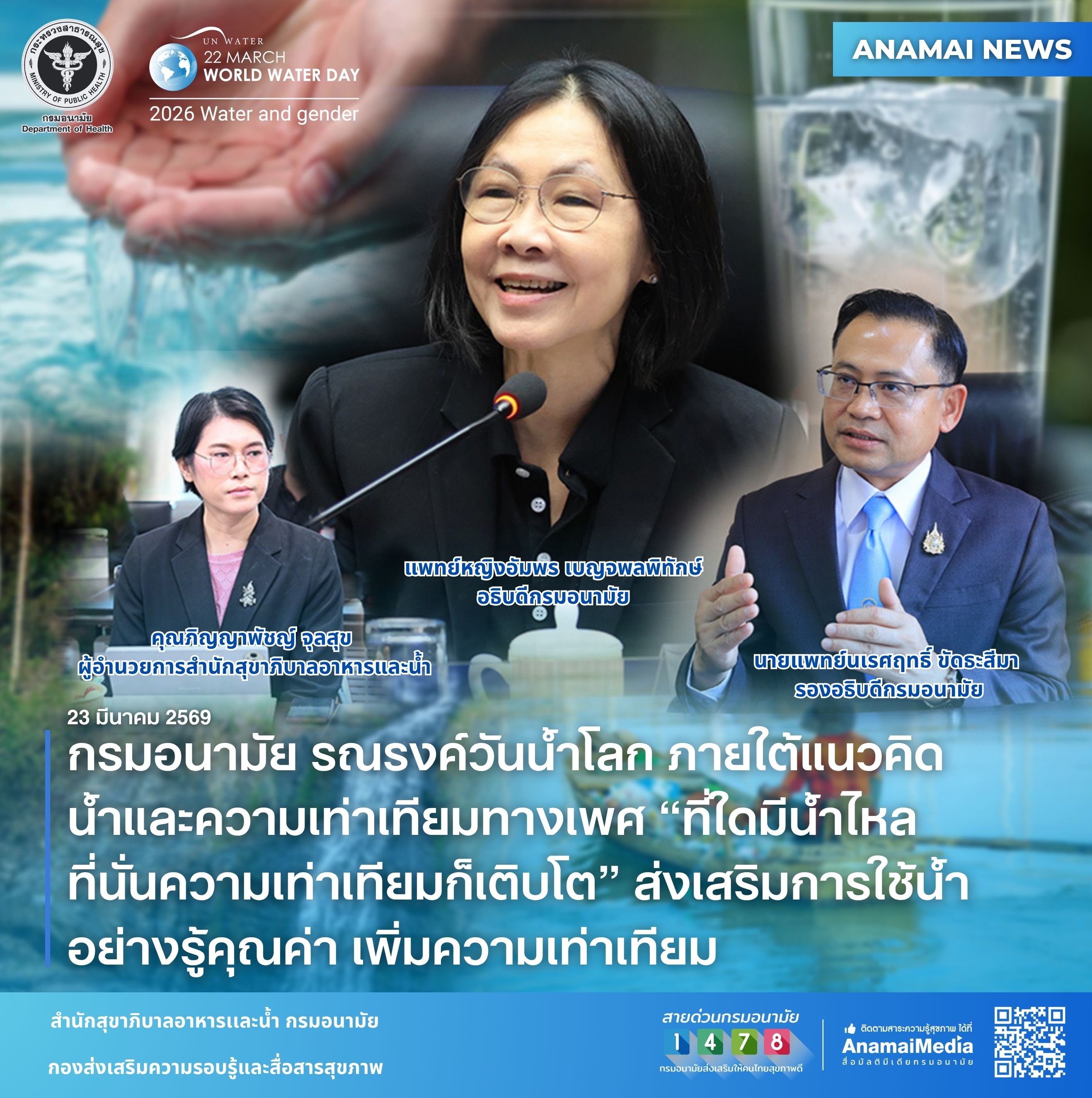 แพทย์หญิงอัมพร เบญจพลพิทักษ์ อธิบดีกรมอนามัย กล่าวว่า องค์การสหประชาชาติได้กำหนดให้วันที่ 22 มีนาคมของทุกปี เป็นวันน้ำโลก (World Water Day) เพื่อให้ประชาชนให้ความสำคัญกับการใช้น้ำอย่างรู้คุณค่ากระตุ้นให้ทุกภาคส่วนร่วมกันแก้ไขวิกฤตน้ำของโลก โดยมีเป้าหมายสำคัญในการสนับสนุน เป้าหมายการพัฒนาที่ยั่งยืนด้านน้ำสะอาดและการสุขาภิบาล (SDG 6) เพื่อให้ประชาชนทั่วโลกสามารถเข้าถึงน้ำดื่มสะอาดอย่างปลอดภัยและยั่งยืน สำหรับปี 2569 ประเด็นหลักของวันน้ำโลกคือ “น้ำและความเท่าเทียมทางเพศ” เพื่อสะท้อนให้เห็นถึงความเชื่อมโยงระหว่างการเข้าถึงน้ำสะอาดกับความเท่าเทียมทางสังคม โดยเฉพาะบทบาทของผู้หญิงและเด็กผู้หญิงซึ่งในหลายพื้นที่ทั่วโลกยังคงต้องรับภาระในการจัดหาน้ำเพื่อใช้ในครัวเรือน รวมถึงเผชิญกับข้อจำกัดด้านโอกาสทางการศึกษา สุขภาพ และเศรษฐกิจ การพัฒนาระบบน้ำสะอาดที่มีคุณภาพและเข้าถึงได้อย่างเท่าเทียมจึงถือเป็นปัจจัยสำคัญในการลดความเหลื่อมล้ำทางสังคมและยกระดับคุณภาพชีวิตประชาชน ประเทศไทยให้ความสำคัญกับการพัฒนาระบบน้ำสะอาดในระดับชุมชน โดยเฉพาะระบบประปาหมู่บ้าน ซึ่งเป็นแหล่งน้ำสำคัญสำหรับประชาชนในพื้นที่ชนบท โดยกรมอนามัยได้ส่งเสริมการยกระดับคุณภาพระบบผลิตน้ำประปาให้ได้มาตรฐาน “ประปาดื่มได้” ของกรมอนามัย พ.ศ. 2563 เพื่อให้ประชาชนสามารถบริโภคน้ำที่สะอาด ปลอดภัย และได้มาตรฐานด้านสุขาภิบาลน้ำ